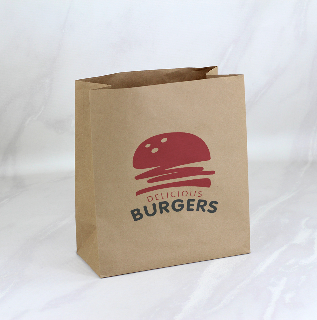 Print Fresh te ofrece esta bolsa en kraft o bond vertical pequeña, caben hasta 8 hamburguesas, 8 papas y servilletas.
