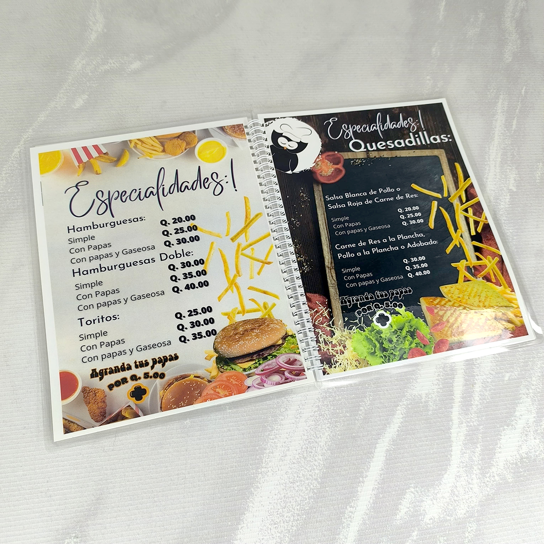 12 Menús Restaurantes Tamaño Carta Con Espiral Laminados 6 HOJAS/12 PAGINAS